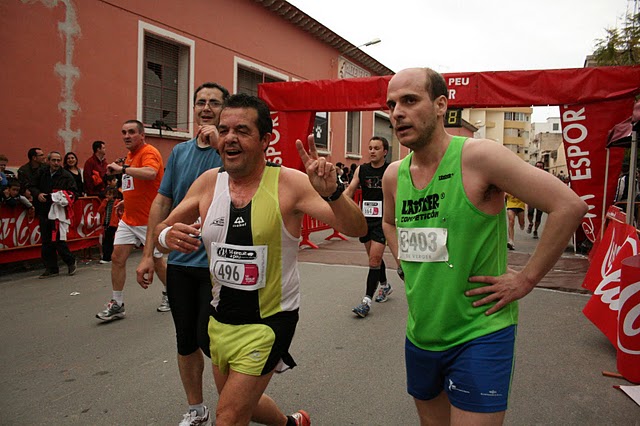 Nuestro club aportó doce corredores. Los primeros en llegar fueron Patricio y Miguel M. a una media de 4:09 m/km, le siguieron José Barceló que se incorporaraba al circuito 4:18 m/km y Toni Serrat que hizo una gran remontada, dado que salió muy retrasado, a 4:20 m/km. A continuación llegó nuestro compañero Domingo, que este año está que se sale, a una media de 4:25 m/km. Luego llegué yo, que al ser llana mejoré el tiempo que estaba realizando últimamente, a 4:40 m/Km., me seguia Mati que se estaba reservando para correr el día siguiente 25 km de montaña. Le seguía Sergio que con dolores estomacales le salió a 4:59 m/km. A continuación entraba Antoni Serrat que en su reincorparación a la carrera llegaba delante de su tio Vicent (5:02 - 5:13 m/km repectivamente). Mencionar la espectacular entrada en meta de Antonio Monge, al que apenas le dió tiempo de cambiarse y corrió con el dorsal y el chip en la mano y cuando cruzaba la meta tuvo que agacharse (a 5:12 m/km). Y finalmente recogiendo el farolillo rojo del grupo nuestro compañero Jose Carlos que se incorporaba también al circuito le salió a 5:24 m/km.